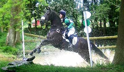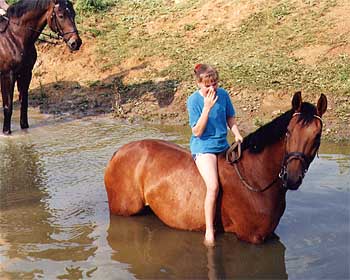 Im Sommer, wenn es so richtig heiß ist, empfinden es die Pferde als sehr angenehm, durch den kühlen Ententeich zu stapfen. Antje hat auch ihren Spaß dabei... |