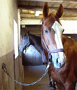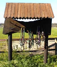 ![]() Damit die Halfter der weidenden Pferde nicht verdrecken, werden sie fein säuberlich und trocken aufgehängt. |